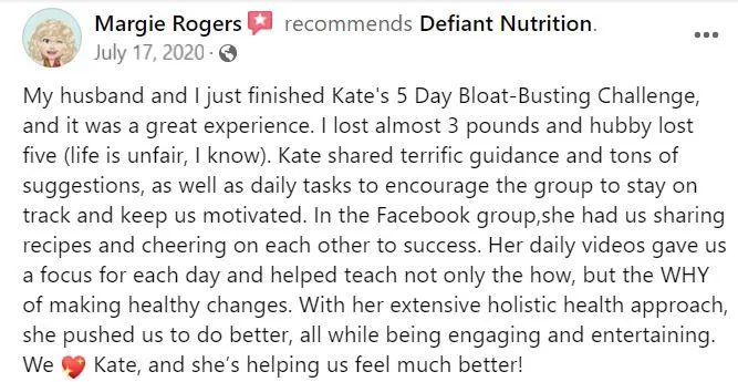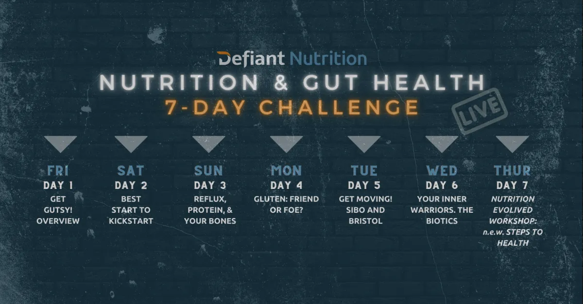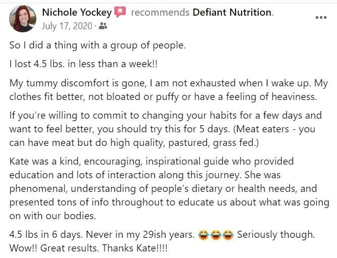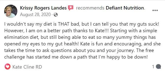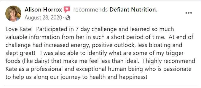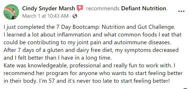 Hey! I'm Kate Cline, Functional Medicine Dietitian and Owner of Defiant Nutrition, where we defy the status quo of chronic illness treatments. This program is a game-changer for people looking to soothe their GI, reduce joint pain and stiffness, and/or boost their workout performance, giving them real results in only 7 days.